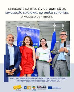 A acadêmica Maria Laura Pereira, matriculada no 10º semestre do curso de Direito da Universidade Federal de Santa Catarina (UFSC) e membro do Grupo de Estudos Europeus UFSC/CNPq, é vice-campeã do Modelo UE Brasil, simulação nacional da União Europeia ocorrida entre os dias 25 a 27 de setembro de 2025 em Brasília (DF).