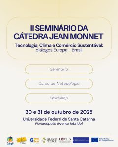 Nos dias 30 e 31 de outubro, será realizado o II Seminário da Cátedra Jean Monnet sobre “Tecnologia, Clima e Comércio Sustentável: diálogos Europa–Brasil” na Universidade Federal de Santa Catarina (UFSC), sob a coordenação da profa. Aline Beltrame de Moura.